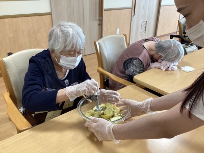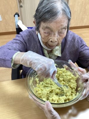 きび秀華苑ショートステイでは、10月16日におやつ作りイベントとして「スイートポテト作り」を行いました。