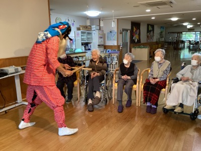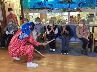 勇壮な太鼓の音に合わせて披露された「荒神払い」の舞を、利用者様は笑顔で見物され、ハナが持つササラ(割り竹)で肩や足を“トントン”と厄払いしてもらうと、「ありがたいねぇ」「元気で過ごせそう」と喜ばれていました。