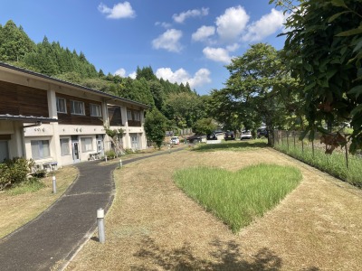 そこで今回は、「草刈りも楽しみながらできて、入居者様にも喜んでいただけるように」と、巨大なハートマークを作ってみました💖