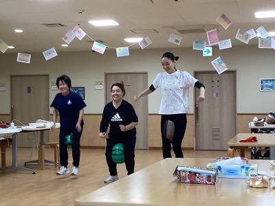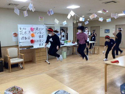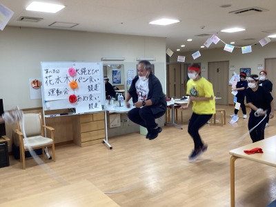 職員が2名ずつチームになり、何回飛べるかを競いました。久しぶりの縄跳びに四苦八苦しながらも、利用者の皆さまが「がんばれー!」と大きな声援を送ってくださり、見事最高記録は22回!大盛り上がりでした👏