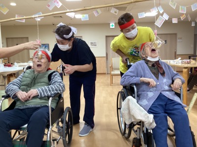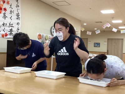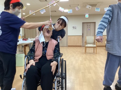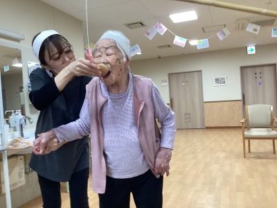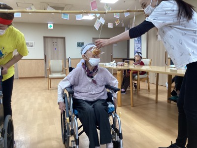 利用者の皆さまが手を使わずに口でアンパンをキャッチ!見事なタイミングで“バクッ”とくわえる姿に拍手と笑いがあふれました。
