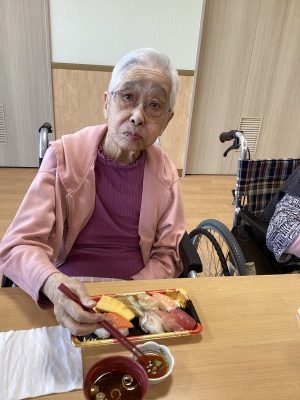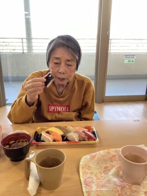 ずらりと並んだ色とりどりのお寿司を前に、利用者様は自然と手が伸び、