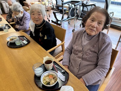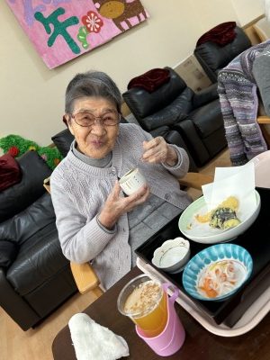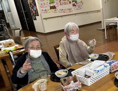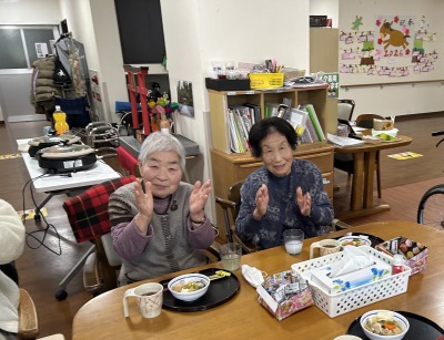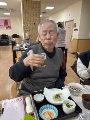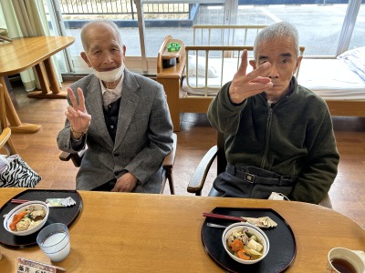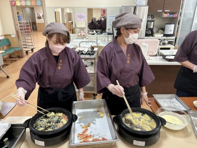 当日は、栄養士と職員が協力し、揚げたての天ぷらをはじめ、茶碗蒸し、赤飯、お雑煮など、お正月にちなんだお食事を用意させていただきました。