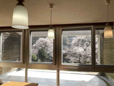 窓辺に集まり、ゆったりと桜を眺める時間が流れています。