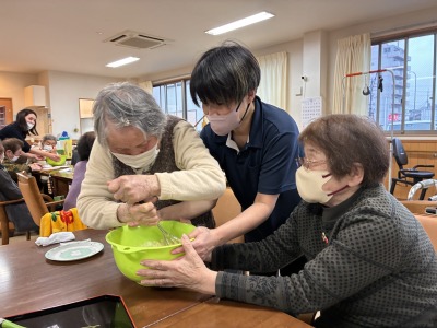 甘い香りが広がる中、「久しぶりに作ったわ」「ふわふわでおいしい」と大好評でした。中には、3枚もおかわりされる方もおられ、笑顔あふれるひとときとなりました。